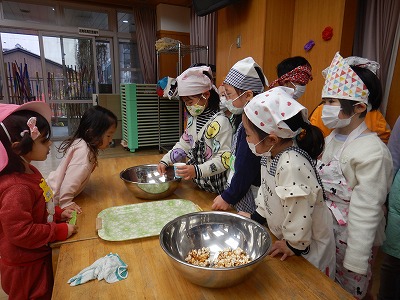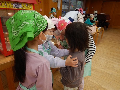 今日は待ちに待ったポップコーンパーティーの日。5歳児が1学期から育てて収穫したポップコーンを地域の方からお借りしたマシーンを使って調理しました。暑い夏休みも毎日水やりをして守ってくださった地域の方と、幼稚園の小さい組さんや先生たち、みんなを招待しようと5歳児で計画し、この日のために準備をしてきました。朝からはりきって会場づくりをしたり、役割分担や交代をしながらお店の人になりきったりしました。小さい組さんに優しく席案内をしたり、何味が食べたいか聞いたりなど、お兄さんお姉さんらしい姿がたくさん見られました。「おいし〜い」「おかわり!」と、お客さんから嬉しい言葉がたくさん返ってきて、ポップコーンパーティーは見事大成功でした!!