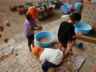 触ってみるとフワフワでとても気持ちよく、子どもたちは手や足をぬかの中に入れて感触を楽しんでいました遊んでいるうちに「水を入れたい」「砂を入れてみたいな」「もっと混ぜよう」と、“やってみたい”“試してみたい”という気持ちが強くなってきて、友達と一緒に思いきり楽しむ姿がありました。身近にある様々な素材にふれながら遊ぶことを楽しんでいきたいと思います。