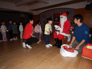 みんなで歌をうたっていると、外からなにやら鈴の音が聞こえてきました。あれ?と思って窓を見ると、なんとそこには本物のサンタクロースがいたのです。「うわー」「本物だ」と大興奮の子どもたち。ドキドキしながらサンタさんからプレゼントをいただきました。