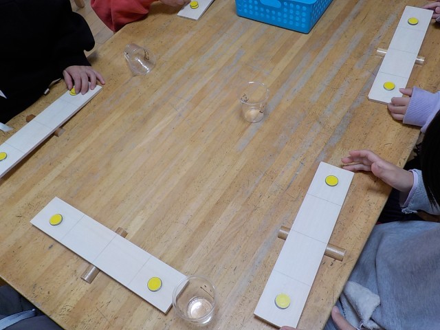 ミニシーソーで木の板がまっすぐになるようにおもりを置いたり、