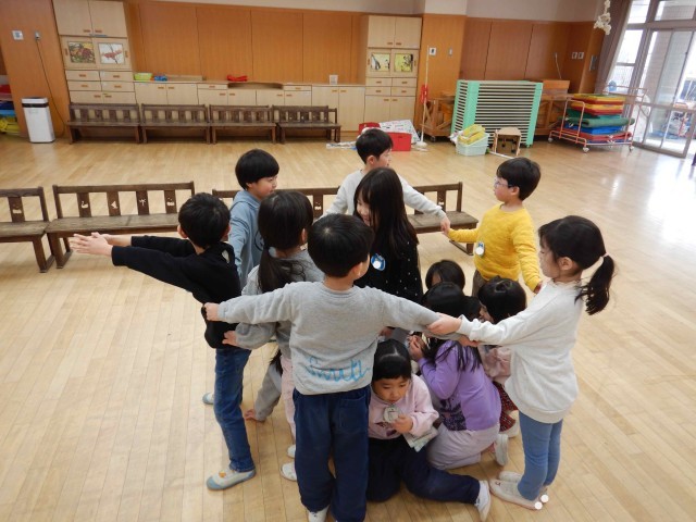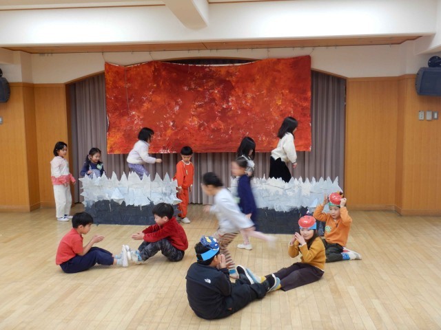 5歳児は、両クラスともお話をもとにみんなで劇遊びを楽しんでいます。言葉や動きなど、「こうしたらどう?」と毎日相談し、やってみることを繰り返しています。役以外に、道具の出し入れなども自分たちでして、遊び全体をみんなで進めています。昨日、今日と他のクラスの遊びを見合いっこしたことで、刺激を受ける姿もあります。来週はいよいよ発表会です。みんなで気持ちを一つに楽しみたいと思います。