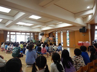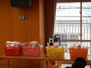 また、「3学期にどんなことをしてきたかな?」と言葉を掛けると、生活発表会、雪遊び、マラソンなど、次々と思い出したことを伝えてくる姿が見られ、みんなで振り返る時間も大切にしました。春休みの過ごし方も子ども達と共に考え、自分で自分を守ることも、声を揃えてしました。その後は、お楽しみの進級記念作品を頂きました。自分たちが心を込めて作った作品を手渡されると、とても喜んでいました。