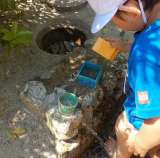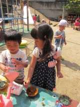 いろいろな色水遊びをしています。(3歳児)