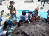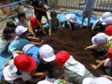 昨日混ぜ合わせた栄養満点の土で各学年が夏野菜を植えました。5歳児がオクラの種をま...