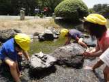 さぁ,ザリガニ釣りに挑戦中!エサのスルメでザリガニをおびき寄せて・・・「あっ,あ...