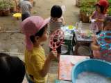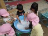 3歳児の子どもたちは,最近,泡遊びが大好きです。今日はとてもいい天気で,子どもた...
