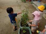 3歳児は、クラスでミニトマトとオクラを育てています。今日は、少し色づいてきたミ...