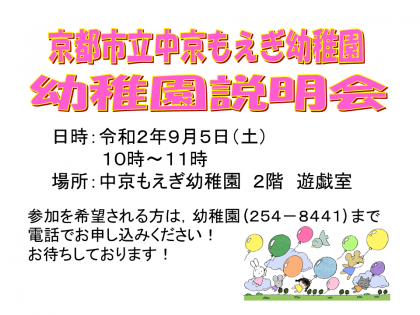 9月5日(土)10時から幼稚園説明会をします。感染防止のため,申込制とさせていた...