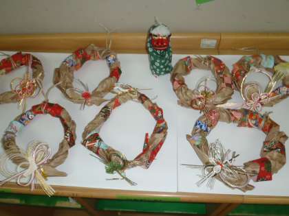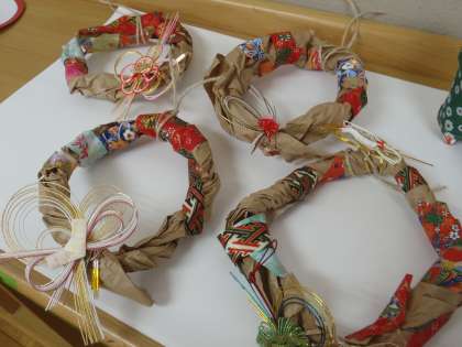 「おうちの門のとこに飾ってあった」とお正月飾りにも興味をもち、正月行事に触れてきました。そこで、年長児たちは手づくりのお正月飾りをつくりました。和紙で飾り付けたりときれいな飾りが保育室を飾っています。