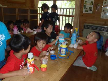 昨日、一学期の終業式をし、今日からゆり組は花背山の家にお泊り保育に来ています。一泊二日、クラスの友達や先生、そして、他の幼稚園の友達と一緒に過ごします。