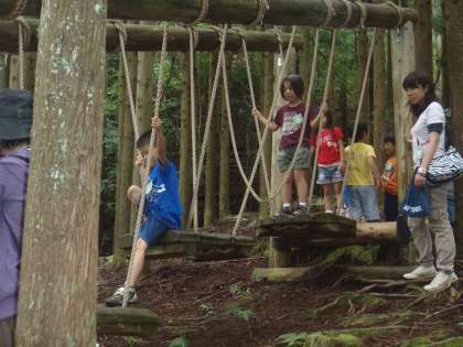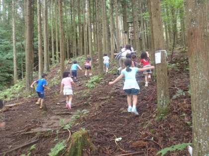 朝ごはんを食べて元気モリモリになった後、フィールドアスレチックに行きました。「忍者の修行だ!」と張り切って山の坂道を登ったり、ターザンロープで遊んだり、全身をつかって自然の中での遊びを楽しんでいました。