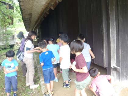 アスレチックで遊んだ帰り道、古い民家を見つけました。「忍者の家かも?!」と見つけた子どもが言いました。みんなで見に行ってみると、床下に小さな穴のような跡が・・・「これ、誰かの足跡じゃない?」「手裏剣の刺さったあとだよ!」「扉から、なんか声がした!」などと、想像を膨らませながら、友達や先生と一緒にその家をぐるりと見て回りました。山の方には細い階段も見つけました。「これ、忍者の修行の道や!」 なんだか忍者に興味津津のゆり組の子どもたちでした。