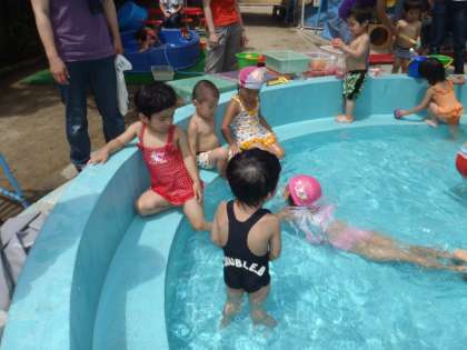 夏季プール最終日。今日は未就園の子どもたちがたくさん遊びにきてくれました。お家の人と一緒におもちゃで遊んだり、幼稚園のお兄さん・お姉さんとかかわったりしていました。お兄さん・お姉さんがつかっているおもちゃで遊びたいようで、小さいプールにも入って一緒に遊んでいる姿がありました。