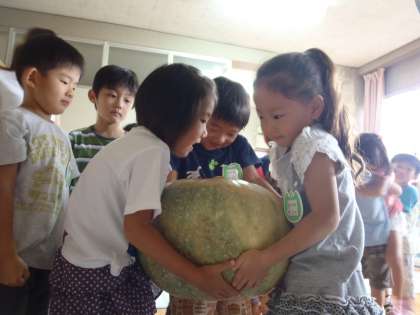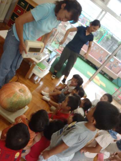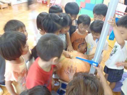 それから・・・子どもたちだけでなく、地域の方から頂いた大きなかぼちゃも一緒に重さ・高さを測りました。とても大きなかぼちゃに子どもたちもびっくり!体重計にのせて測ってみると・・・なんと16キログラムもありました。高さは、みんなが使っている身長計では目盛がなく、残念ながら測ることができませんでした。実際に大きなかぼちゃを持って、重さを実感した子どもたち。今日は少し特別な発育計測になりました。