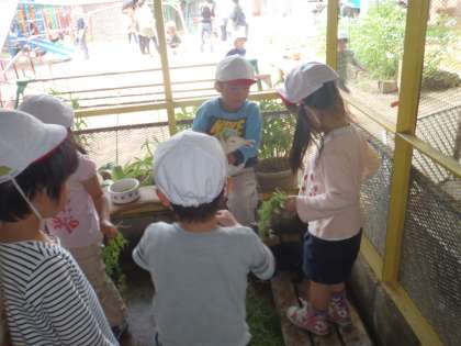 年長さんは、うさぎ当番をしましたよ。エプロンと長靴を着用し、気分は、動物園の飼育係さんのようです。うさぎ小屋を掃除したあと、野菜を包丁で、うさぎが食べやすい大きさに切り、ボールに入れ、うさぎに野菜をあげました。「野菜うまく切れた!」「うさぎ、野菜たべたよ」とお世話することが嬉しくて、年長として誇らしげな表情が見られました。