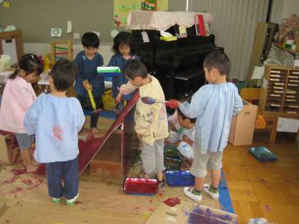 ばら組は、絵の具で遊びましたよ。大きな段ボールに友達と一緒に色をつけ、重ねていくことが楽しくなったり、手や足につけて「おばけだぞ〜!」と一階にも下りておどかしに行ったり、紙を見つけて「ここでするわ」と、自分なりに遊ぶ場所を見つけて絵の具に触れていたり・・・ 一人一人が自分なりにおもしろさを見つけて遊んでいました。最後はみんなで雑巾がけもして、すっきりとした気持ちで遊びを終わることができていました。