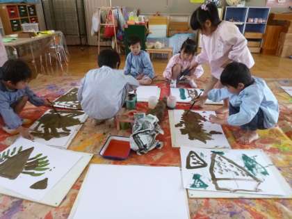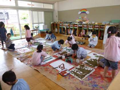 そんな筍を、今日はゆり組(5歳児)の子ども達が絵の具でかきました。その形や色のおもしろさを見ながらかいたり、自分なりに絵の具の色を選び、書くことを楽しんだりしている様子がありました。