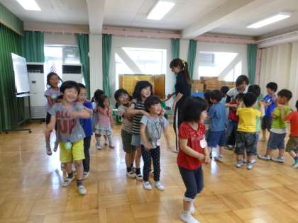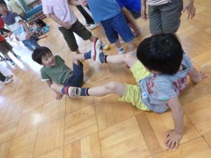 最後には、ジャンケン汽車もしました。二つのクラスの子どもが混ざり合って、「じゃんけんぽん!」「やったー!」「負けた〜!がんばって!応援するし!」と話しながら楽しく遊びました。