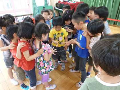 今日は、みんなでなかよし遊びをしました。去年も遊んでいた『みんなとあそぼ』の踊りをしたり、ひっつきもっつきで遊んだりしました。「ぴったんこ〜!」で友達と体がくっつくことが嬉しく、笑顔いっぱいで遊んでいました。足をくっつける時も、足の裏をくっつけていたのですがそのくっつけ方もいろいろで、「こうしてみよう・ああしてみよう」と友達と話しながらやっていました。