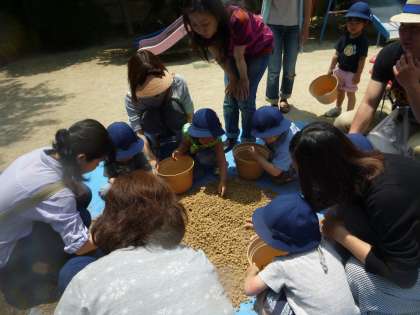 自分の植木鉢をもらうと、「これに入れるん?」「トマト、好き!」「食べられるかなぁ?」など、お家の人と話しながら植えていました。植えた後には、水もたっぷりあげました。おいしいミニトマトができるように、明日からも水やりしてお世話しようね!