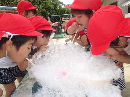 ストローをみつけて石けん水を吹き出す子どもの姿を見て「やりたい,やりたい」とみんなストローを使って吹き始めました。偶然に隣の友達の泡とくっついて,洗面器から膨れ上がる泡に大喜びでした。自分の洗面器で自分の泡を大切に楽しむ子,また,友達と一緒に楽しむ子,一人一人がいろいろな試しや発見をしていました。