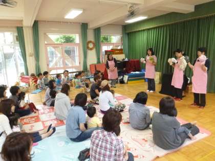 パペットを使っての歌から始まり、パネルシアターに紙芝居、大型絵本など、次々に楽しいことをしてくださるので、子ども達も「次はなにかな?」「おもしろいなぁ!」と声をあげながら楽しんでいました。最後には、大きな布を使ってパラバルーンもしてくださいましたよ。布が通っていくおもしろさや、風が通る気持ちよさを感じていました。