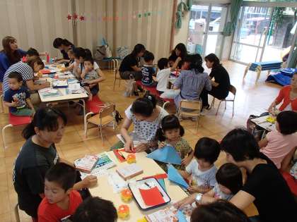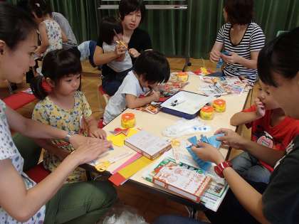 今日は、ばら組の子どもたちがお家の人と一緒に七夕の飾りをつくりました。七夕の歌をみんなで歌ってから、いろいろな飾りを作り始めましたよ。