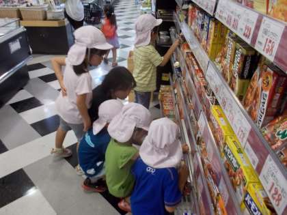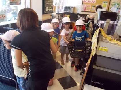 お金が入った封筒からお金を出して、お釣りをきちんと受け取っていました。買い物カゴも、どのグループも忘れずに片付けていましたよ。いつもお家の方の姿を見ているのですね。さすがゆり組さんです。