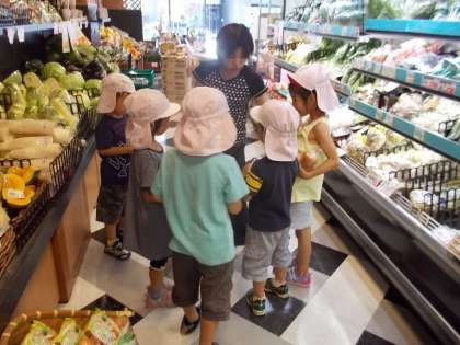 今日は、明日のカレーパーティーに向けて、ゆり組(5歳児)が買い物に行きました。グループに分かれて、たまねぎ・ニンジン・カレールーを買いました。