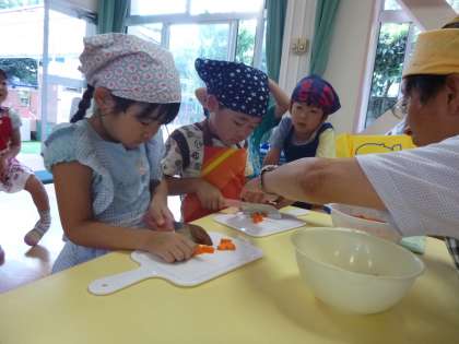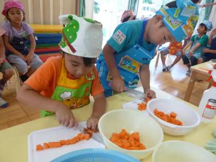 ゆり組は、にんじん・たまねぎ・じゃがいもを一人ずつ切りました。