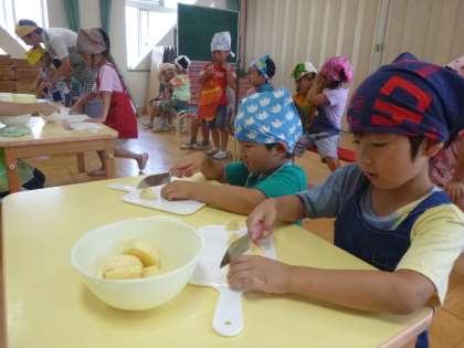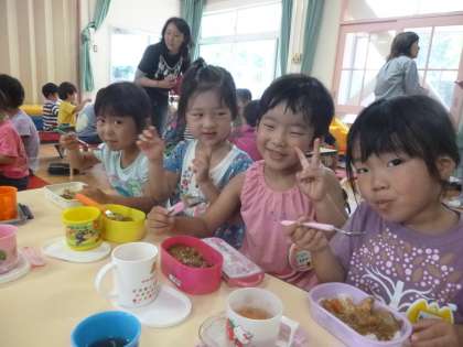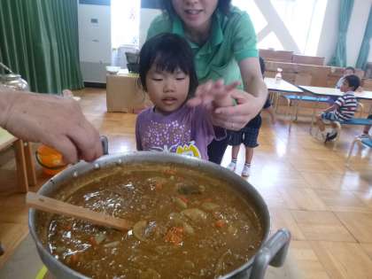 カレールーは、気を付けながら子ども達が入れていきました。ぐつぐついい匂いが幼稚園中に広がってきましたよ。