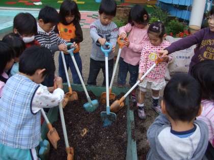 今日は土づくりをして,個人鉢にチューリップとクロッカスの球根を植えました。土をつくっていく中で,ミミズを見つけたり,「土,ふわふわやなあ」など言ったりして楽しんでいました。遊びに来てくれていた来年幼稚園に入園する子どもたちも,一緒にきれいな花を植えていました。