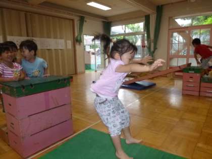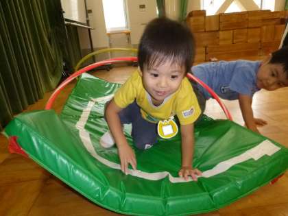 少し高いところからジャンプしたり、一本橋を自分なりの歩き方で渡ってみたり、マットのトンネルも通ってみたりと、いろいろと体を動かして楽しみました。