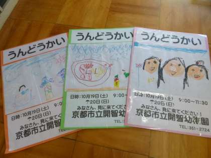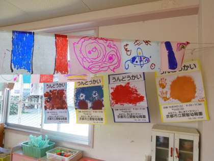 朝からみんなで体操をしたり、かけっこをしたりを繰り返しています。新しい体操も覚え、朝からしっかりと体を動かしています。かけっこもスピードがはやくなってきて、「がんばれー!」と応援する声も大きくなってきました。子ども達の絵を貼ったポスターや、旗もできあがってきて、運動会の雰囲気が高まってきています。