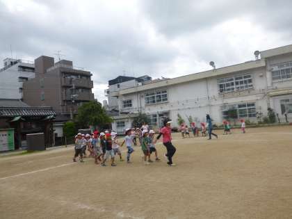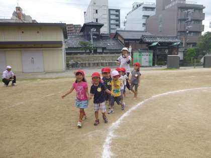 運動会の日は、はじめみんなでグラウンドをぐるりと歩きます。今日、初めて当日のように歩いてみました。3度目の運動会となるゆり組(5歳児)の子ども達がかっこよく歩く姿を見て、ばら組(4歳児)、たんぽぽ組(3歳児)の子ども達も同じように歩きました。本番をイメージして少し真剣な表情だったり、友達と一緒に歩くのが嬉しくて笑顔いっぱいだったり、いろいろな表情で歩く子ども達でした。