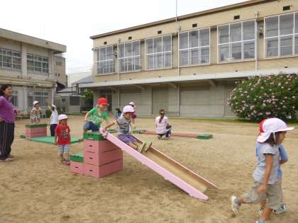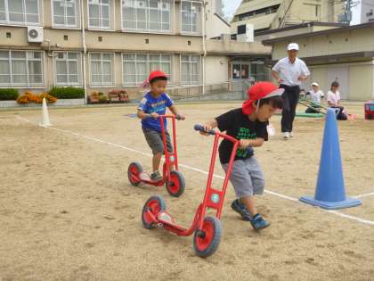 また、それぞれのクラスでの競技も見合いました。自分達が頑張っていること、楽しんでいることを見てもらったり、他のクラスがしていることを見たりして、「すごいなぁ!」「おもしろそうだなぁ!」と話している様子もありました。3学年の子ども達が共に過ごしている幼稚園ならではの姿だなと思いました。