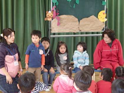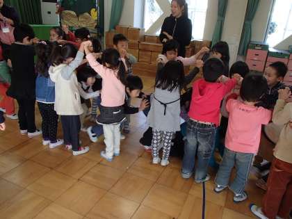 今日は,11月生まれの誕生会でした。全園児で誕生児のお祝いをした後,『あの橋が落ちるまえに』をして遊びました。全園児で仲よし遊びができるようになって成長を感じました。