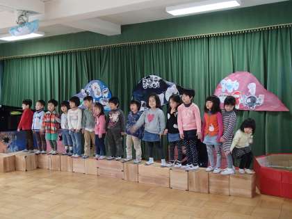 子どもの中には、いつもと違ってお客さんがいることに少し戸惑いを見せる子どももいましたが、みんないい表情で表現することができました。本番でも,子ども達の楽しんでいる様子を見てもらえたらと思います。どうぞよろしくお願いします。