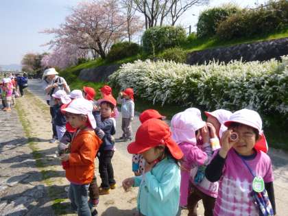 今日は,ばら組(4歳児)とゆり組(5歳児)の子ども同士が手をつなぎ,鴨川堤までお散歩に出かけました。初めて,年中組の子どもをリードしていくので,ゆり組のお兄さん,お姉さんはやや緊張気味でしたが,川が見えてくると,「川が光ってる」「川の音がする」「鴨がもぐって魚をとってる」などいろいろな発見をし,自然の心地よさにリラックスし始めました。ばら組の子どもたちも一生懸命よく歩きました。今日は川の水が少なく,河原に下りることもでき,ごろごろした石の上を探検気分で歩いてみました。川の水を触っている子どももいました。滅多に下りれない河原で遊ぶことができ,幼稚園に帰っても「楽しかったなぁ」「また行きたいな」と話していました。