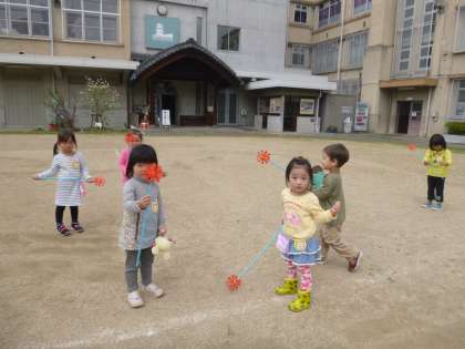 今日,たんぽぽ組はこいのぼりの矢車で遊びました。学校歴史博物館の広いグラウンドに初めて行くと,嬉しそうな表情で走り出す子ども達でした。