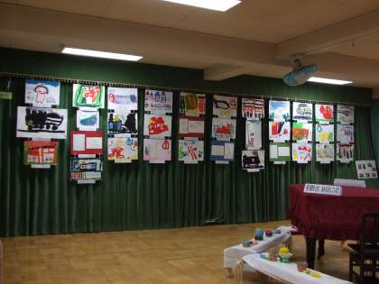 今日と明日,遊戯室にて園内展をしています。子どもたちのかわいい作品を展示しています。遊戯室が美術館のようになっていて,興奮気味の子どもたち。自分の作品や友達の作品を見つけて「あった,あった!」と嬉しそうに言っていました。おうちの人と一緒に見てさらに嬉しそうな子どもたちでした。