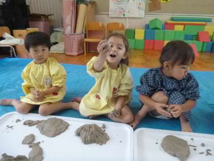 今日は、土粘土遊びをしました。初めは丸めたり、細長くしたり、ちぎってみたり・・・と、指先だけで小さく触っていた子ども達も、時間の経過とともに手だけでなく足で踏んだりしながら、全身を使っていろいろな感触を楽しんでいきました。「雪だるまができた!」「お化けだよ!」「リニアモーターカー走ってきたよ!」と次から次へと形が変化することを先生に伝えたくて部屋の中はとてもにぎやかでした。