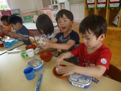 今日は,ゆり組(年長児)が作った豆ご飯をみんなで食べました。たんぽぽ組(年少児)はラップで握ったおにぎりを,ばら組(年中児)はボールに移した豆ご飯をゆり組が「豆ご飯ができました。みんなで食べて下さい。」と持ってきてくれました。「ありがとう。」とお礼を言って,みんなで美味しく食べました。たんぽぽ組は,口いっぱいにほおばって食べる子や「豆ご飯おいしいなぁ。」先生や友達と言って食べました。ばら組は,ラップにくるんだ豆ご飯を自分で握って食べました。できたてのご飯に,「あちちっ!」と言いながらも手のひらで転がして,まん丸にしたり「ハートにする。」「おにぎりは三角。」と言いながら握るのも楽しんでいました。みんなで水やりをして育てたり,豆むきをしたりした豆ご飯だったので,少し豆が苦手だった子も「握ったらおいしくなる。」と言って食べていました。