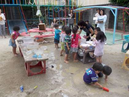 たんぽぽ組の子ども達は色水や泡で楽しく遊ぶことができました。研究保育を行う前にできる限りの時間をかけて準備しています。遊びを保障するために,担任の先生が頭を悩まして考えぬいて保育指導案という計画を立てました。さらにその保育指導案をもとによりよい遊びができるように教員同士での話し合い,検討を重ねました。研究保育が終わってから,集まった教員全員で今日の研究保育から学んだことを話し合いました。このような一連の営みがこつこつと積み重ねられて,研究保育を提供してくれた担任の先生はもちろんのこと研究協議に参加した教員の力量も高まります。こうして,子ども達のために,もっといい先生になるための修行が続きます。真摯に,存分に研究することができる幼稚園でありたいなと思います。