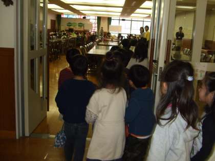 ゆり組の子どもたちが、楊梅幼稚園の友達と一緒に、洛央小学校の1年生と給食をいただきました。少し緊張していた子どもたちでしたが、1年生に、絵本を読んでもらったり、折り紙を教えてもらったり、なぞなぞやしりとりをしてもらったりして、気持ちがほぐれたようです。あちらこちらのテーブルで楽しそうな声がいっぱい聞こえてきました。