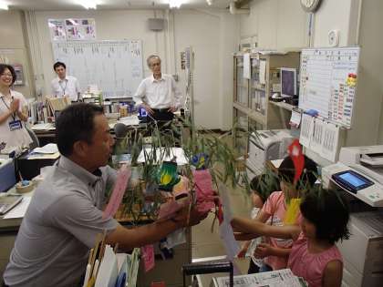 今日,ゆり組(年長児)はいつもお世話になっている学校歴史博物館に飾ってもらおうと,七夕の笹飾りをお届けにいきました。「いつもお世話になっています。」「グラウンドや講堂を貸してもらってありがとうございます。」「いつもありがとうございます。これからもよろしくお願いします。」など,グループごとに言葉を考えて学校歴史博物館の方に受け取っていただきました。「いつも使ってもらっていいですよ。」とありがたい言葉も話していただき,子どもたちもうれしそうでした。