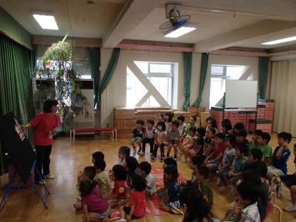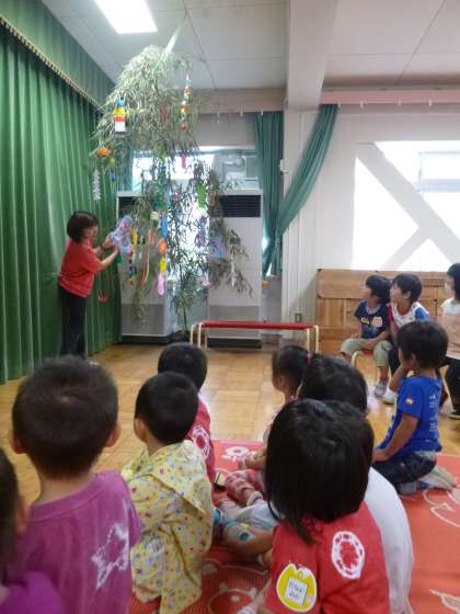 今日は7月7日,七夕の日です。子ども達もこの日のためにたくさんの笹飾りをつくって楽しみにしていました。七夕の集いでは,遊戯室に飾ってある大笹を見て,先週末に小笹を持って帰って家で飾りを付けた話や,短冊に書いた願い事の話をしていました。その後,♪たなばた♪の歌をみんなで歌ったり,パネルシアターを見たりしました。「織り姫様と彦星様会えるかな?」「私,会えるようにお願いした。」と言って,今日の夜を楽しみにしていた子ども達もいました。朝から天気が曇り空ですが,天の川見えるかな・・・?