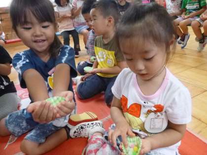 七夕の話を聞いた後,一人7粒ずつ金平糖を食べました。「7つの星が繋がってる“北斗七星”って言う星があるんだよ。」「7つの願い事を思いながら一つずつ食べてね。」と,先生の話を聞いて願い事を考えながら食べていました。みんなの願い,届くといいね。