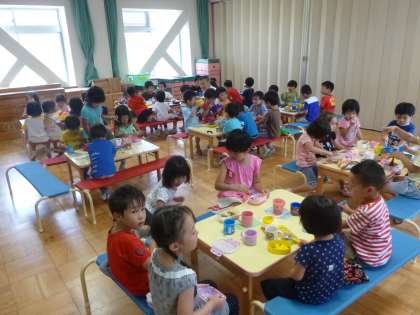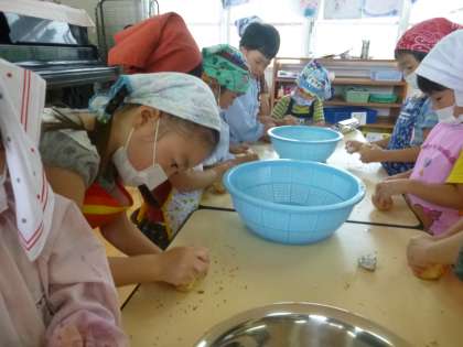 ばら組(年中児)も自分たちで掘ったジャガイモの皮むきをしました。丸めたアルミホイルの角でごしごしむきました。最初はなかなかむけずに「むけへん〜」「どうやってするん?」と言っていた子もいました。それでも頑張ってこすっているとだんだんと皮がむけてきて「なんか良いにおいがしてきた。」「せんせい勝負な!」と言って一生懸命に磨いていました。皮むきができたジャガイモは,ゆり組(年長児)にバトンタッチをして,包丁で切ってもらいました。
