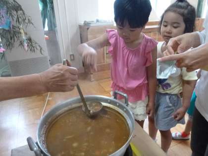 しばらくして,ゆり組が野菜を切って炒めて煮込んでいるお鍋に,ゆり組・ばら組でカレールーを入れました。ぐつぐつしている鍋を見て,慎重にそっと入れる子や,湯気の熱さに驚き,少し離れたところから入れようとする子もいました。ルーを入れて混ぜているとカレーの良いにおいが園内に広がって,たんぽぽ組(年少児)も食べるのを楽しみにしていました。